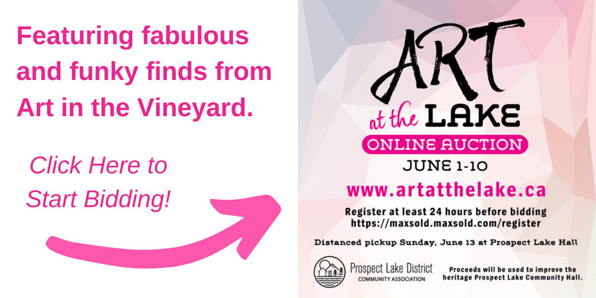 www.artatthelake.ca to reach the auction site, and check the bidding during the busy time just before closing. Successful bidders will receive instructions for a socially distanced pickup on Sunday, June 13 at the Prospect Lake Hall.